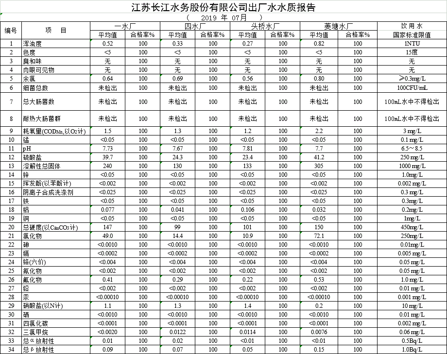 自來水水質(zhì)報(bào)告(2019年7月份)