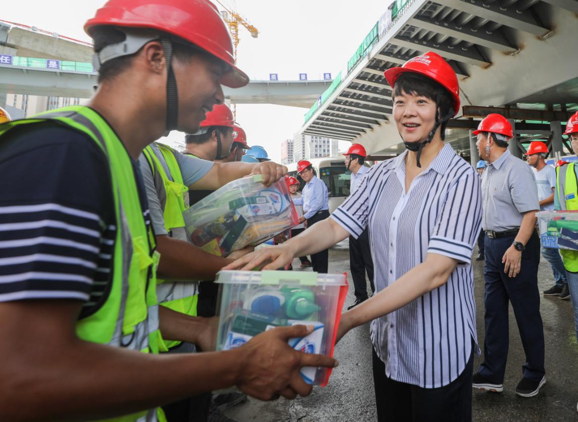 張寶娟一行實地察看了國泰創(chuàng)新中心、潤揚快速路、長江水務(wù)和揚州古城保護(hù)成果展示館,詳細(xì)了解項目建設(shè)情況。在潤揚路快速化改造工程江陽路互通立交施工現(xiàn)場,張寶娟給一線的工人們送上防暑物品。她囑咐企業(yè)負(fù)責(zé)人,高溫下連續(xù)工作非常辛苦,要確保高溫天氣作業(yè)安全和工程質(zhì)量,科學(xué)合理安排工時,做好防暑降溫工作,確保如期完成工程建設(shè),早日惠及揚州人民。