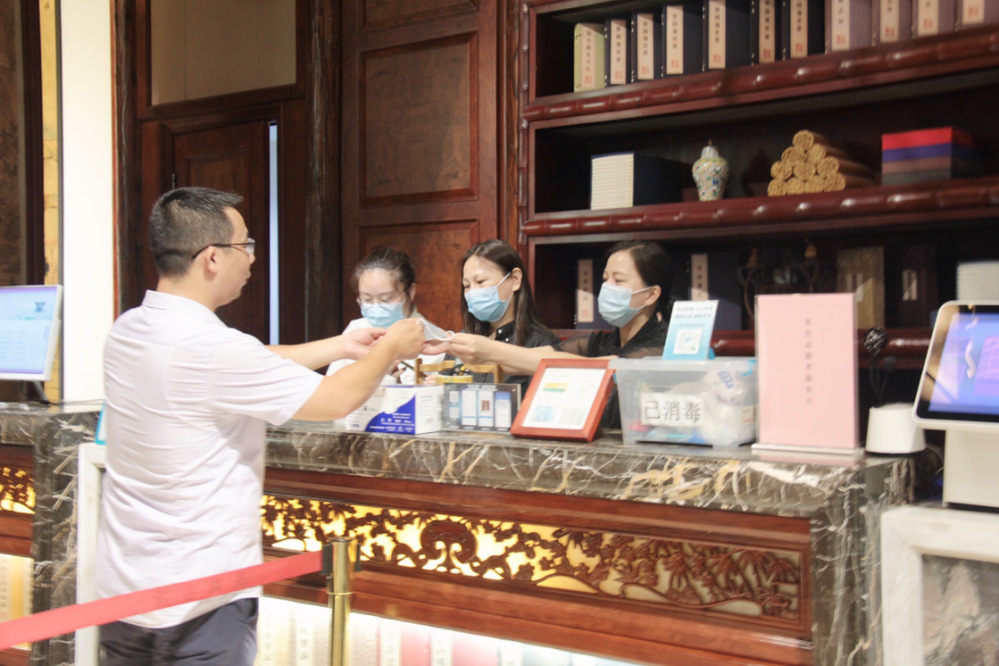 長樂客棧大堂作為旅客辦理入住和退房的公共區(qū)域,客流量較大,屬于疫情防控的第一道關(guān)口。為做好來店人員排查和信息登記工作,志愿者們充分發(fā)揮黨員帶頭作用,同前廳大堂工作人員一道對來店旅客進(jìn)行檢測體溫、查驗(yàn)蘇康碼和行程碼以及發(fā)放口罩,第一時間向旅客們宣傳疫情防控有關(guān)注意事項(xiàng)。