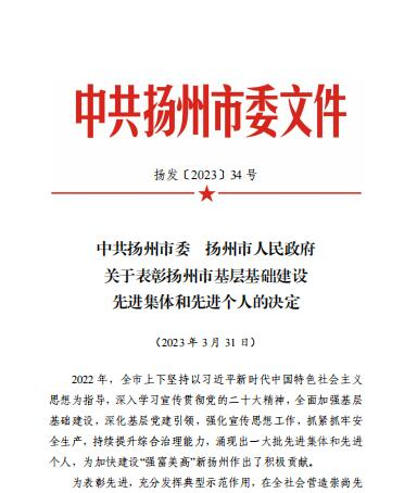 近日,揚州市委、市政府發(fā)布《關(guān)于表彰揚州市基層基礎(chǔ)建設(shè)先進集體和先進個人的決定》,表彰了過去一年在“強富美高”新?lián)P州建設(shè)中,在加強基層基礎(chǔ)建設(shè)、深化基層黨建引領(lǐng)、強化宣傳思想工作、抓緊抓牢安全生產(chǎn)、持續(xù)提升綜合治理能力等多個方面涌現(xiàn)出的一批銳意進取、改革創(chuàng)新、勇于擔(dān)當(dāng)、善于作為的先進集體和先進個人。