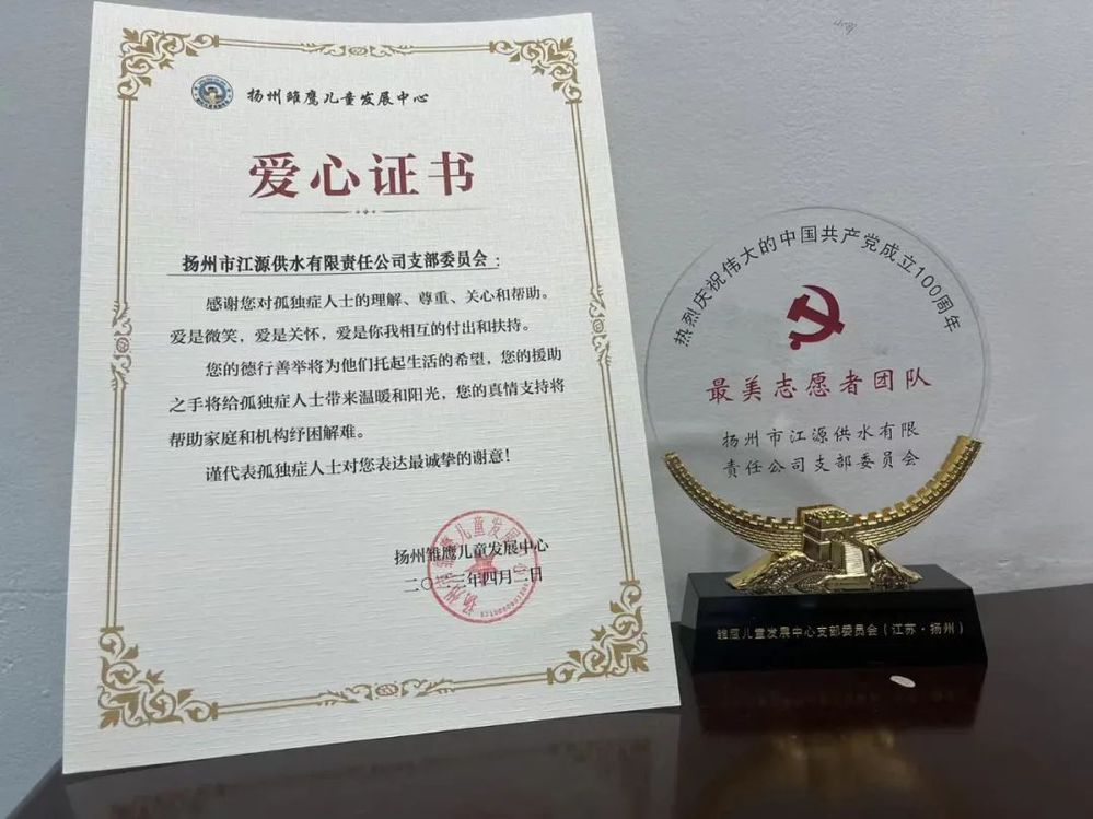 日前,長江水務江源公司“561”供水服務隊榮獲揚州市殘聯雛鷹兒童發(fā)展中心送來的愛心證書,感謝“561”供水服務隊的幫扶和服務,并授予其“最美志愿團隊”稱號。