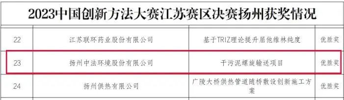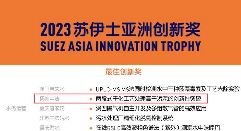 近日,揚(yáng)州中法環(huán)境“兩段式干化工藝處理高含固率污泥”項(xiàng)目因創(chuàng)新程度高、實(shí)用性強(qiáng)等特點(diǎn)獲得了中國(guó)創(chuàng)新方法大賽優(yōu)勝獎(jiǎng)和2023年度蘇伊士亞洲最佳創(chuàng)新獎(jiǎng)。