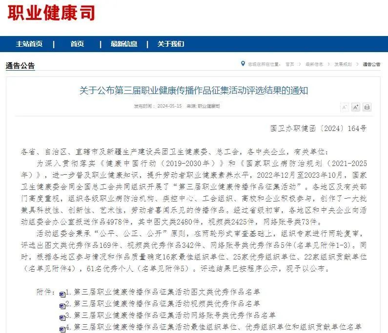為深入貫徹落實《健康中國行動(2019-2030年)》和《國家職業(yè)病防治規(guī)劃(2021-2025年)》,進一步普及職業(yè)健康知識,提升勞動者職業(yè)健康素養(yǎng)水平,國家衛(wèi)生健康委、全國總工會共同組織開展了“第三屆職業(yè)健康傳播作品征集活動”。我公司積極創(chuàng)作,踴躍參與征集活動,選送的《共享職業(yè)健康 共創(chuàng)健康水務(wù)》經(jīng)過初審、形式審查和專家評審等程序,入圍獲獎名單。