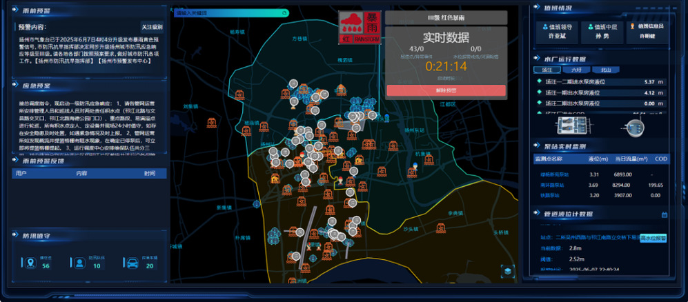 6月6日開始,各相關(guān)部門已根據(jù)天氣預警按照統(tǒng)一部署和既定安排開展污水設(shè)施加密巡查,部署好應急人員、物資隨時待命。6月7日凌晨3時23分氣象部門發(fā)布暴雨藍色預警后,公司立即通過“城排通”系統(tǒng)啟動應急預案,快速落實污水設(shè)施、雨水排口、易積水點和在建工程現(xiàn)場的巡查和應急處置工作。由于突降暴雨,市區(qū)部分道路很快出現(xiàn)積水,且涉及多個高考考點周邊,情況十分緊急,與此同時氣象部門緊急升級發(fā)布暴雨黃色預警。為及時做好處置,公司第一時間調(diào)整了應急響應等級,通過“城排通”系統(tǒng)實時監(jiān)測運行數(shù)據(jù),加強信息共享和部門間應急聯(lián)動,適時調(diào)整運行調(diào)控策略,對發(fā)現(xiàn)的路面積水險情,迅速指揮、調(diào)度搶險班組和物資開展應急排澇。